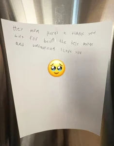 “Hey mom, here’s a thank you gift for being the best mom and good morning I love you,” one note read, which Goebel found taped to the refrigerator.