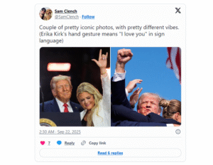 During her speech, Erika made a touching hand gesture that caught the attention of many attendees. She formed the American Sign Language symbol for “I love you” and pointed it toward the sky. This symbolic act was interpreted as a heartfelt message to her late husband, signifying enduring love and spiritual connection.