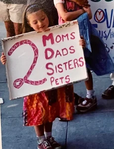 “I think people assume gay families come with some kind of agenda,” she explains. “My parents were always so clear that we could be or do anything. They never forced us to subscribe to any ideology beyond treating others with love and respect.”